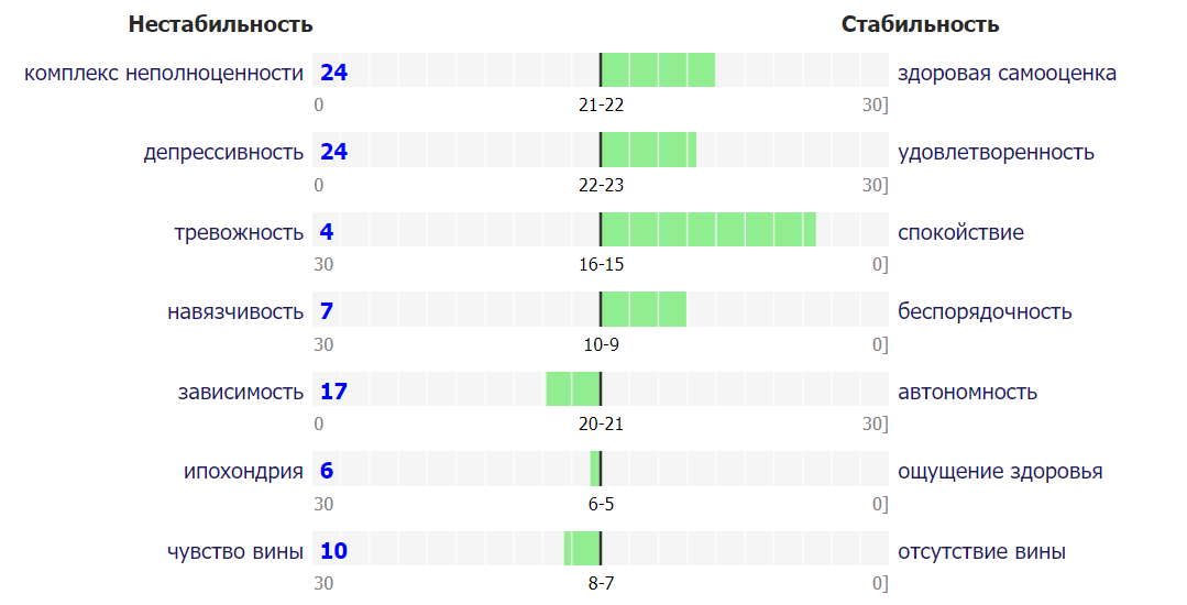 Странноватый тест, некоторые вопросы заставили растерянно чесать затылок, но всё равно интересный! Последний пункт в результатах правда удивил, ибо отвечал "да" на вопросы по типу "вы помните о том что делали, часто вспоминаете свои ошибки", поскольку, ну. Всё прекрасно помню х) Но мучаться чувством вины? Не про меня. А зависимость... не люблю, когда за меня решают против моей воли, но совсем не против, чтобы мне помогали выбирать, когда я сам этого прошу, потому что редко знаю, чего хочу. Особенно в бытовухе по типу "что посмотреть".